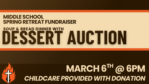 An evening to support the students going to Middle School Spring Retreat. There will be a dinner at 6pm for $5/person (pre-registration required below), a dessert auction to follow where donations will be accepted. Childcare available with donation.