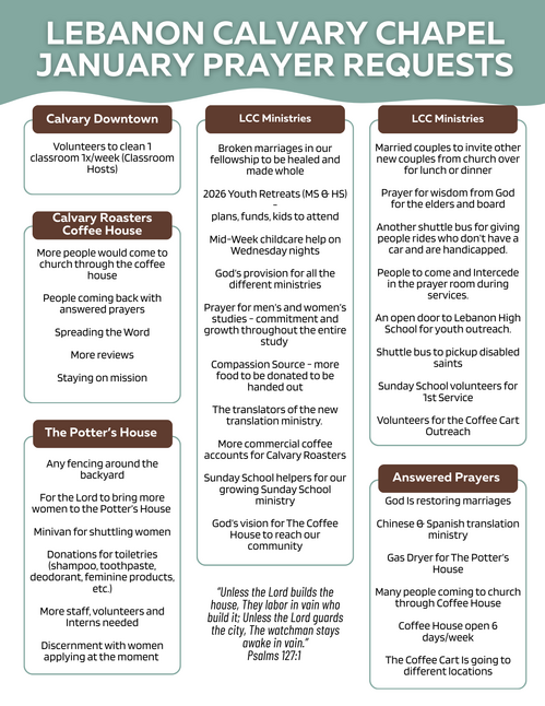 Monthly we'll be posting our current prayer needs. As answers come, we will be including answered prayers as well. Please use the download link here to print it out and refer to it during the week.